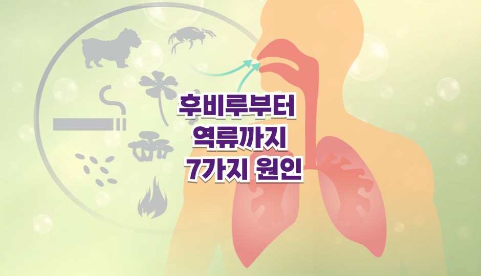 콧물이 코 뒤쪽으로 넘어가면서 목으로 떨어지는 ‘후비루 증후군’은 가장 흔한 원인입니다.